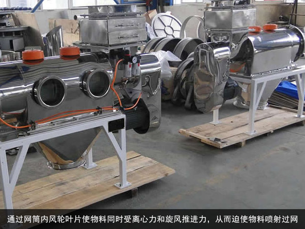 氣旋篩也叫臥式氣旋篩,其材質(zhì)可以為碳鋼也可以為不銹鋼,氣旋篩的篩網(wǎng)為圓筒狀,置于機體內(nèi),物料通過螺旋輸送系統(tǒng)后,和氣流混合、霧化進入網(wǎng)筒內(nèi);通過網(wǎng)筒內(nèi)風輪葉片使物料同時受離心力和旋風推進力,從而迫使物料噴射過網(wǎng),由細料排出口排出,不能過網(wǎng)的物料沿網(wǎng)筒壁從粗料排出口排出。