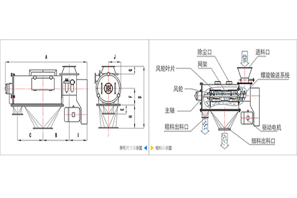 氣旋篩的篩網(wǎng)為圓筒狀,置于機體內(nèi),物料通過螺旋輸送系統(tǒng)后,和氣流混合、霧化進入網(wǎng)筒內(nèi);通過網(wǎng)筒內(nèi)風輪葉片使物料同時受離心力和旋風推進力,從而迫使物料噴射過網(wǎng),由細料排出口排出,不能過網(wǎng)的物料沿網(wǎng)筒壁從粗料排出口排出。