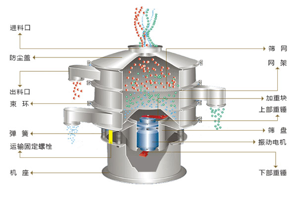 圓形旋振篩是精細(xì)篩分設(shè)備,應(yīng)用于各種粉狀、粒裝、粘液的篩分,應(yīng)用于化工、食品、醫(yī)藥、建材等行業(yè)。