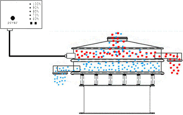 DHC-400超聲波旋振篩由超聲波諧振電源、振蕩器、外網(wǎng)環(huán)和共振環(huán)組成。超聲波諧振電源產(chǎn)生的高頻電振蕩由振蕩器轉(zhuǎn)換成高頻正弦形式的縱向振蕩波,這些振蕩波通過(guò)換能器底座傳到共振環(huán)上使共振環(huán)產(chǎn)生共振,然后由共振環(huán)將振動(dòng)均勻傳輸至篩面。從而實(shí)現(xiàn)物料的篩分。