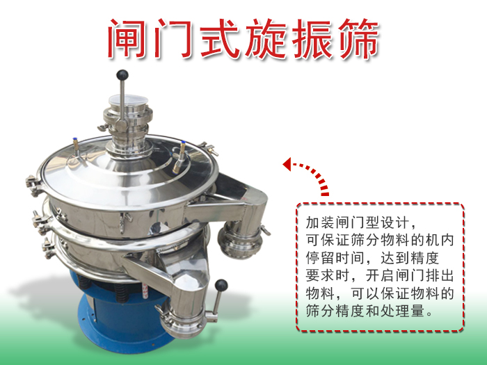 閘門式旋振篩是對(duì)普通旋振篩的結(jié)構(gòu)改造,加裝閘門型設(shè)計(jì),可保證篩分物料的機(jī)內(nèi)停留時(shí)間,達(dá)到精度要求時(shí),開(kāi)啟閘門排出物料,可以保證物料的篩分精度和處理量。