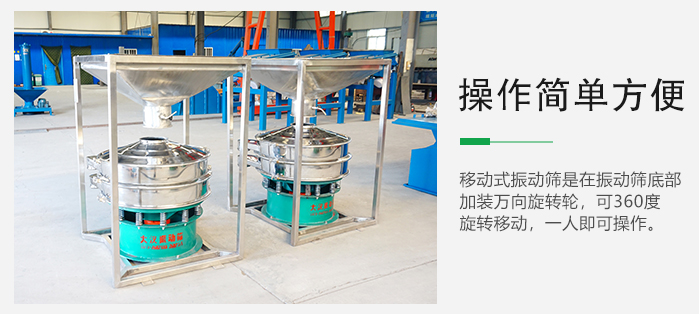 大漢廠家生產(chǎn)的移動式振動篩是在振動篩底部加裝萬向旋轉(zhuǎn)輪,可360度旋轉(zhuǎn)移動,一人即可操作。