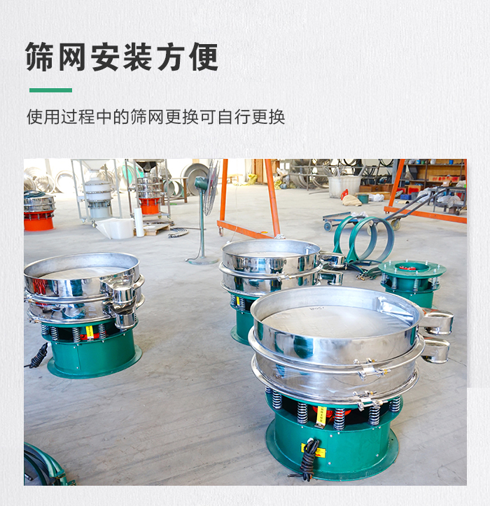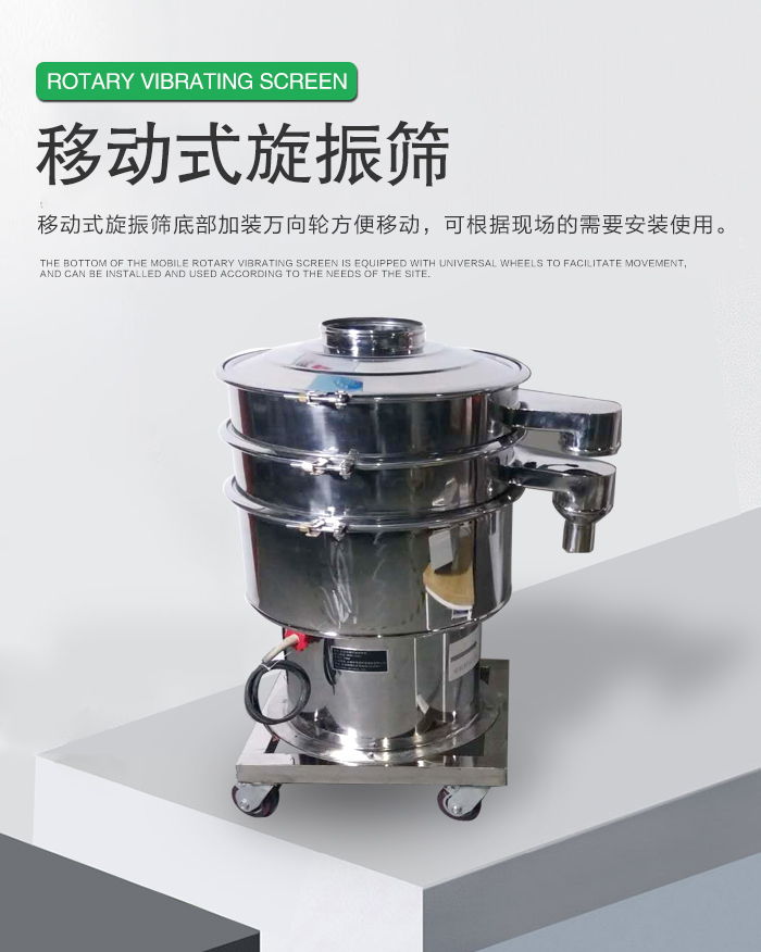 移動式旋振篩底部加裝萬向輪方便移動,可根據(jù)現(xiàn)場的需要安裝使用,旋振篩下面加裝螺桿,防止固定后移動式旋振篩隨意移動,影響篩分。移動式旋振篩型號有直徑400mm,600mm,800mm,1000mm,1200mm,1500mm,1800mm,移動式旋振篩價格是根據(jù)型號和材質(zhì)來訂的