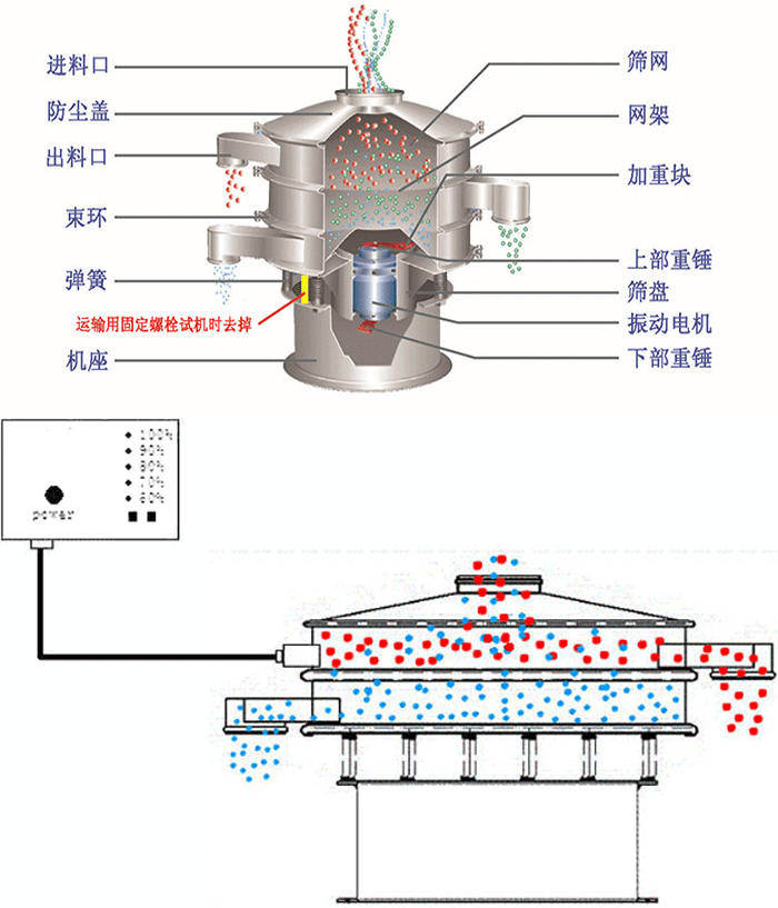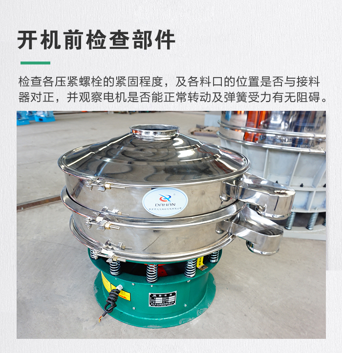 ⑶開機前,應(yīng)先檢查各壓緊螺栓的緊固程度,及各料口的位置是否與接料器對正,并觀察振動電機是否能正常轉(zhuǎn)動及彈簧受力有無阻礙,檢查各層篩網(wǎng)是否壓緊。