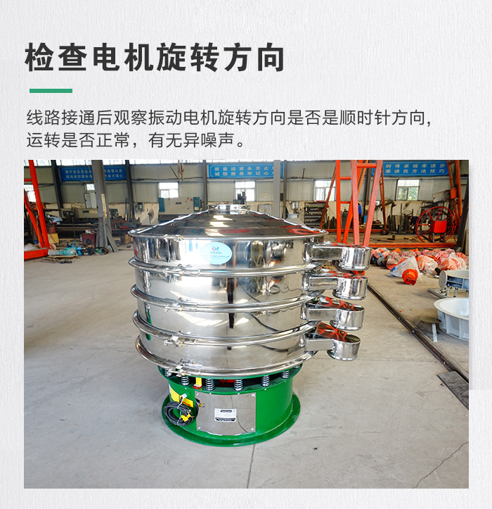 ⑷當旋振篩接入電氣控制盤之前,應(yīng)首先對電氣控制盤進行檢查。線路接通后觀察振動電機旋轉(zhuǎn)方向是否是順時針方向, (備注:否則應(yīng)改變相序)運轉(zhuǎn)是否正常,有無異噪聲。
