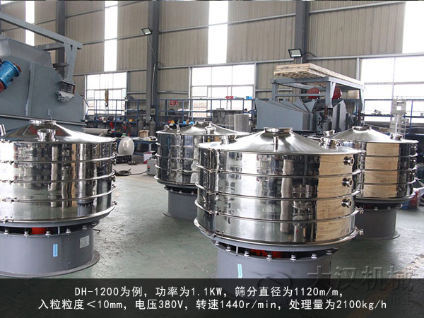 以大漢機(jī)械型號(hào)為DH-1200為例,功率為1.1KW,篩分直徑為1120m/m,入粒粒度<10mm,電壓380V,轉(zhuǎn)速1440r/min,處理量為2100kg/h。