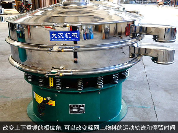 1.改變上下重錘的相位角,可以改變篩網(wǎng)上物料的運(yùn)動(dòng)軌跡和停留時(shí)間。為使篩機(jī)適應(yīng)各種物料所需的分離狀態(tài),如物料的分布、處理量、分離效率、過(guò)網(wǎng)率等各種變化,應(yīng)將它調(diào)整到佳狀態(tài)。