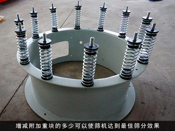 3.附加重塊的調(diào)整。在上下重錘的一測(cè)裝有附加重塊,它的作用是增加篩機(jī)的激振力,根據(jù)用戶篩機(jī)的層數(shù)、物料比重不同來(lái)增減激振力,增減附加重塊的多少可以使篩機(jī)達(dá)到佳篩分效果。
