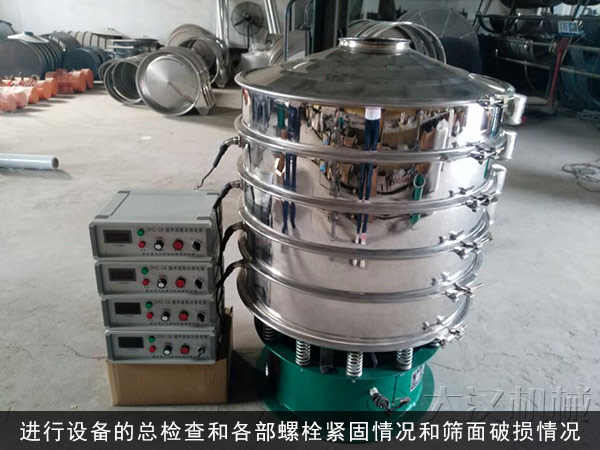 1、超聲波旋振篩操作人員在工作前應(yīng)閱讀值班記錄,并進(jìn)行設(shè)備的總檢查。檢查三角帶的張緊程度、振動器中的油位情況,檢查篩面張緊情況、各部螺栓緊固情況和篩面破損情況。