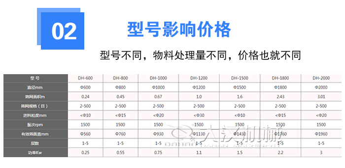 樹脂粉振動(dòng)篩有好幾種型號(hào),例如:DH-600,DH-800,DH-1000,DH-1200,DH-1500,DH-1800,DH-2000;型號(hào)不同,物料處理量不同,價(jià)格也就不同