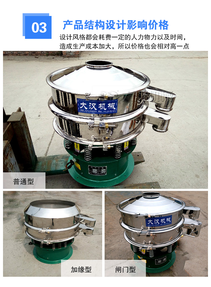 在樹脂粉加工制作時(shí)針對(duì)樹脂粉振動(dòng)篩有多種設(shè)計(jì)方案,有加緣式、閘門式、強(qiáng)力型、密封型等不同類型等,每一種設(shè)計(jì)風(fēng)格都會(huì)耗費(fèi)一定的人力物力以及時(shí)間,造成生產(chǎn)成本加大,所以價(jià)格也會(huì)相對(duì)高一點(diǎn)