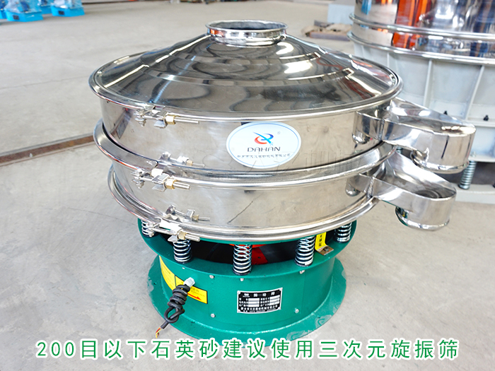200目以下石英砂呈現(xiàn)的就是粉末狀了,篩分過程中就需要考慮到粉塵污染、堵網(wǎng)問題,所以小編建議使用三次元旋振篩來對其進(jìn)行篩分工作。該系列篩機(jī)具有篩分精度高、體積小、換網(wǎng)容易等優(yōu)勢,是200目以下石英砂生產(chǎn)的優(yōu)選機(jī)型;