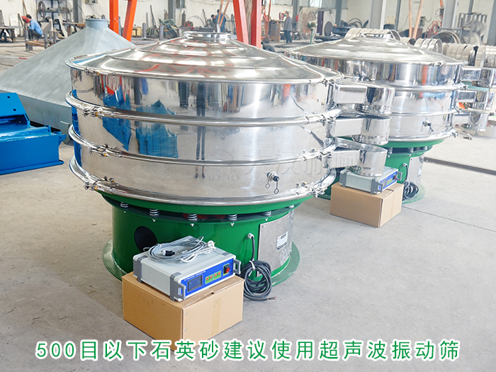 對于500目以下石英砂粉末來說已經(jīng)為高精細(xì)粉末物料,如使用普通篩機(jī)就會(huì)出現(xiàn)堵網(wǎng)問題從而影響篩分精度與產(chǎn)量。對于該類型的石英砂產(chǎn)品就需要使用到另一款篩分設(shè)備-超聲波振動(dòng)篩。該系列篩機(jī)的清網(wǎng)裝置使用的是超聲波系統(tǒng),開啟后篩面會(huì)形成一個(gè)高頻低振幅的超聲振動(dòng)波,使高精細(xì)粉末低空懸浮在篩面粗從而實(shí)現(xiàn)清網(wǎng)及解決堵網(wǎng)問題。